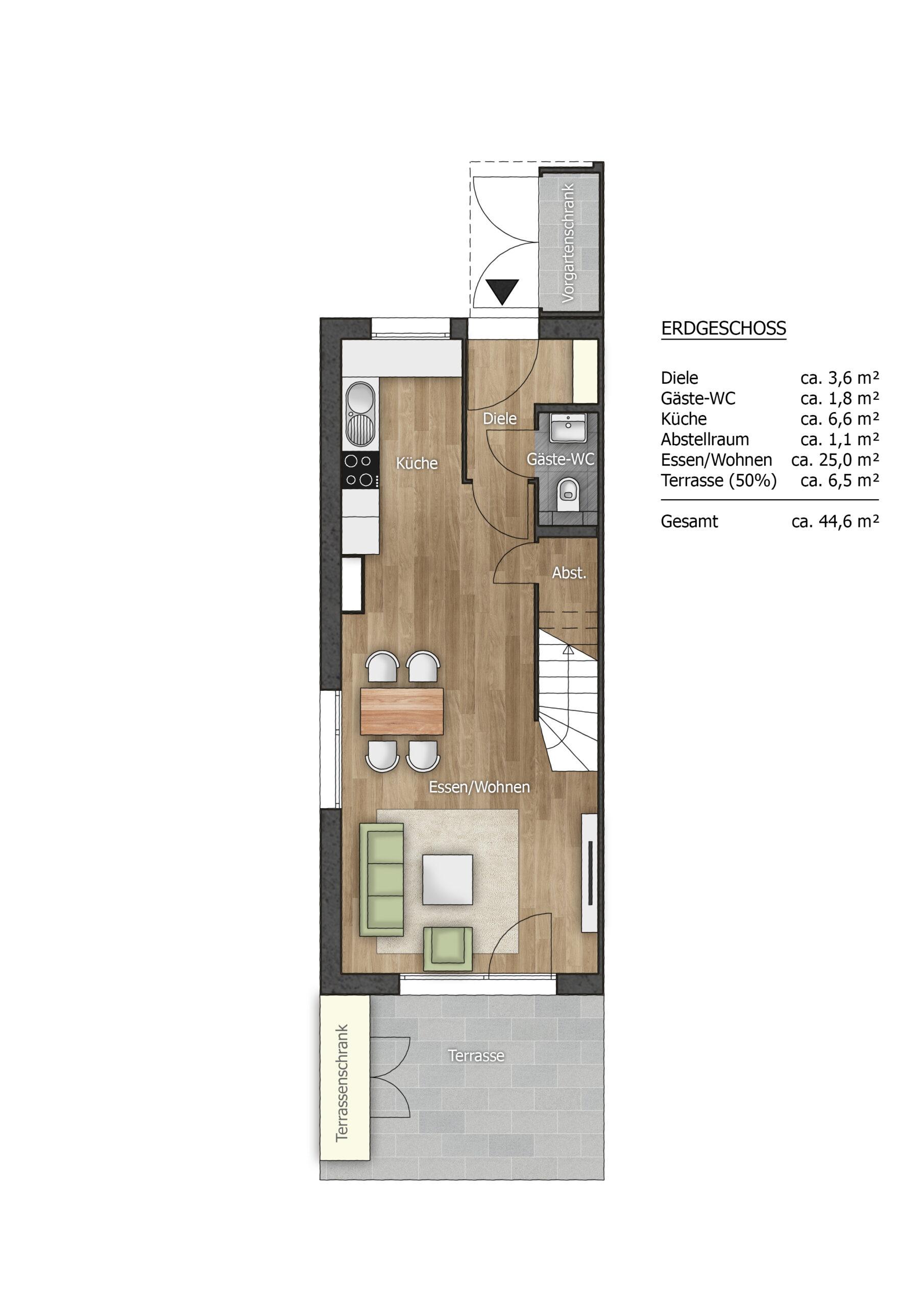 Jede Wohneinheit überzeugt durch eine hochwertige und stilvolle Ausstattung. Von Design-Vinyl-Böden über elektrische Rollläden bis hin zu Bädern mit modernen Sanitärelementen. Mit großzügigen Wohnflächen und praktischen Details wie Gartenboxen und vorgelagerten Schränken wird höchste Wohnkomfort geboten.