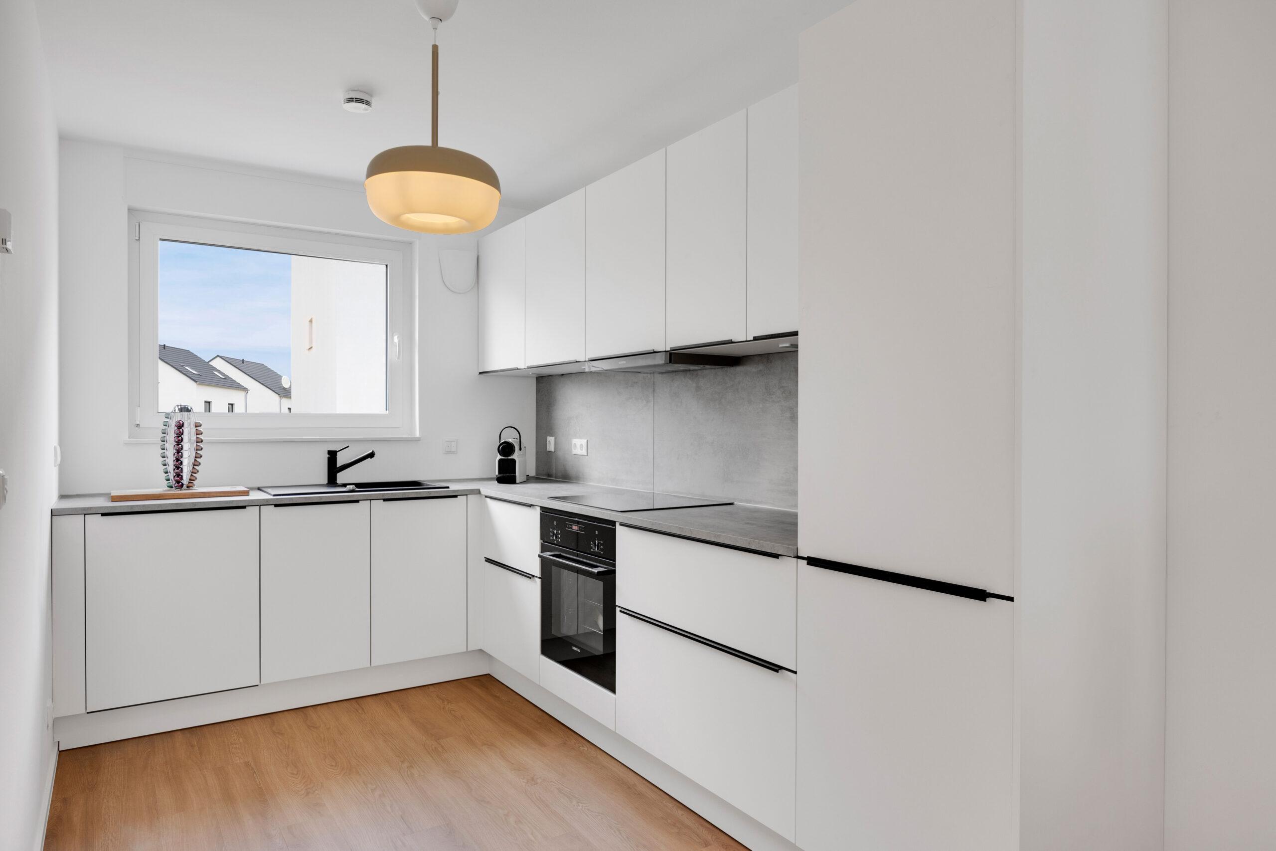 - Mattweise Küchenfronten mit schwarzen Griffleisten