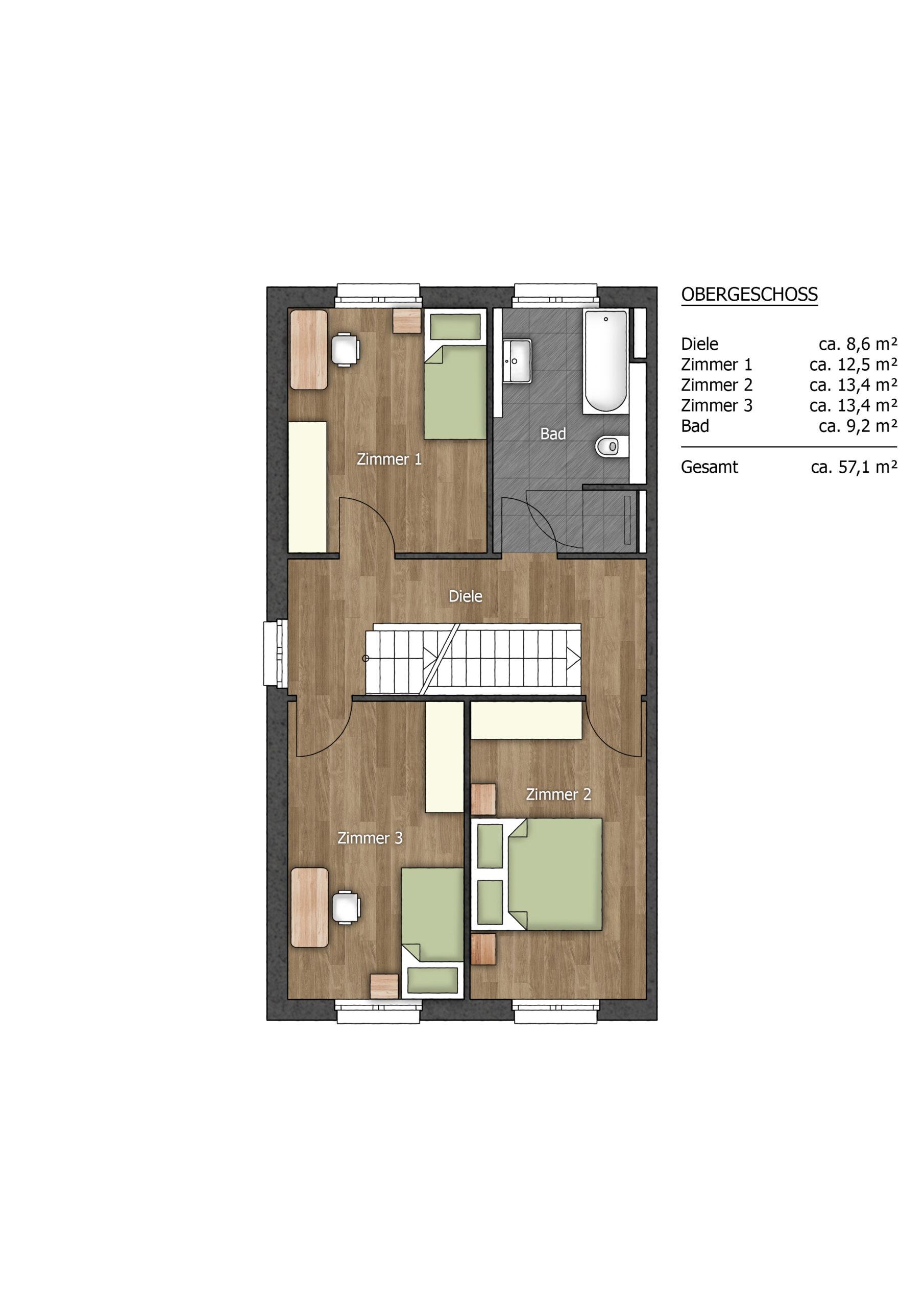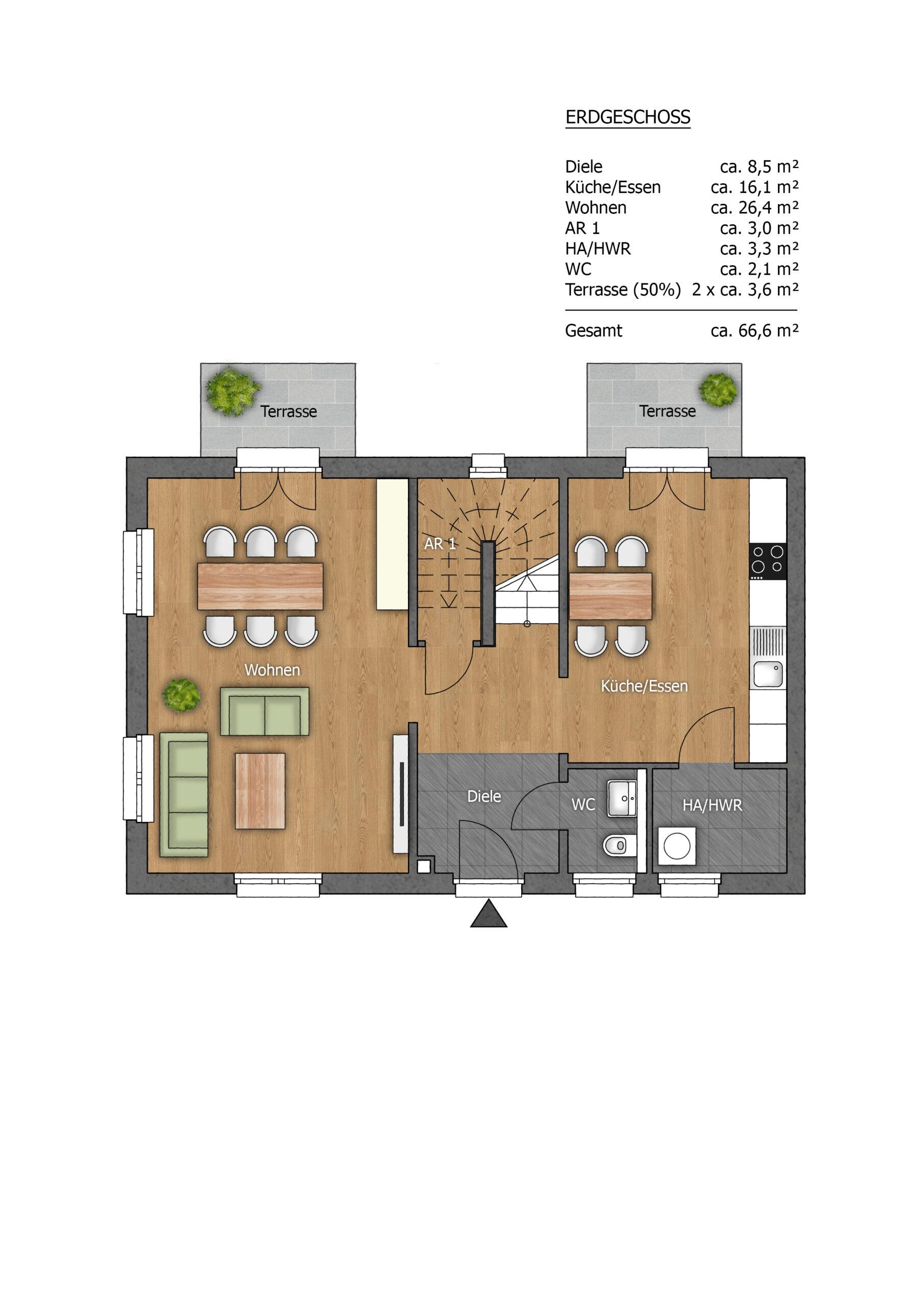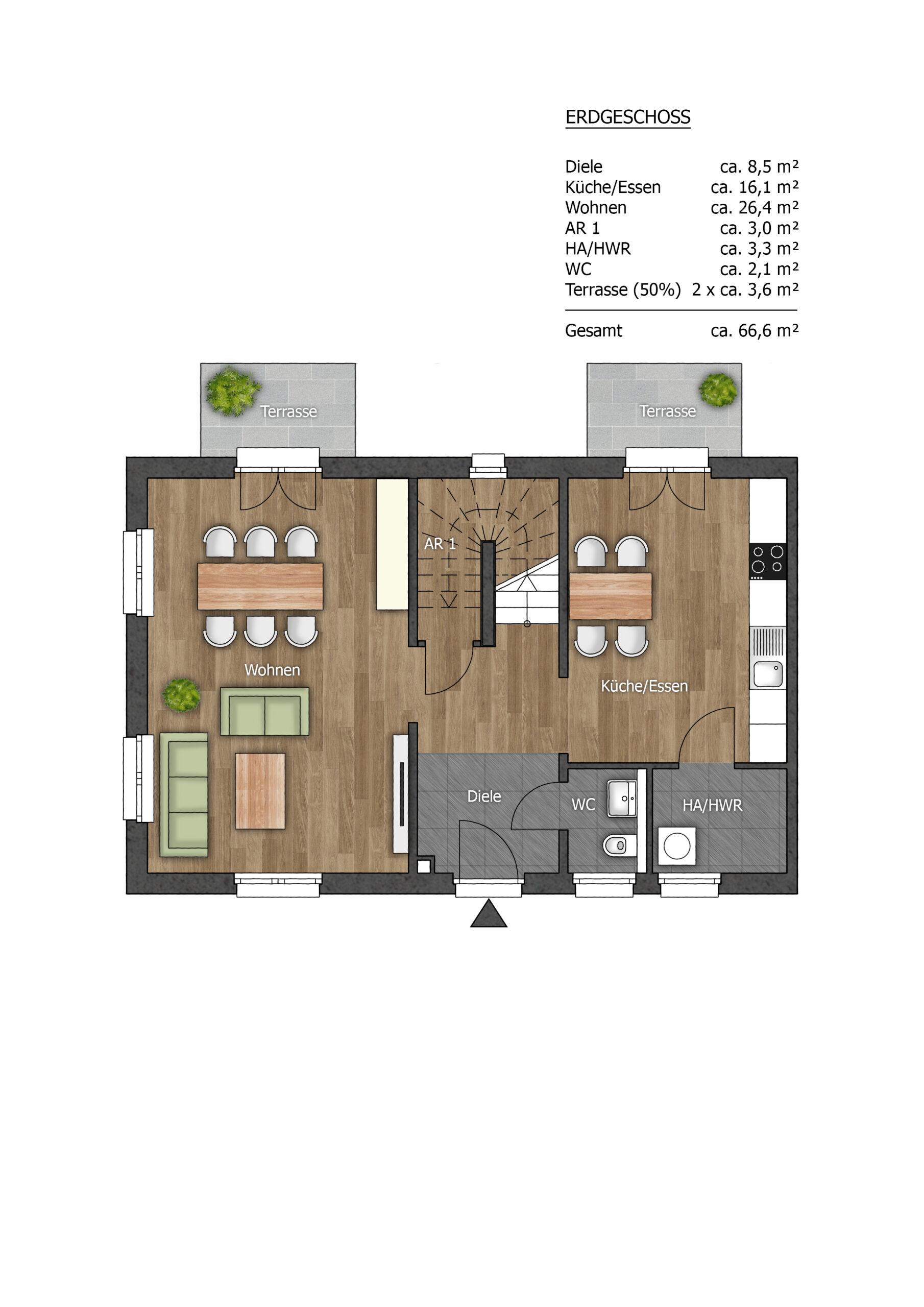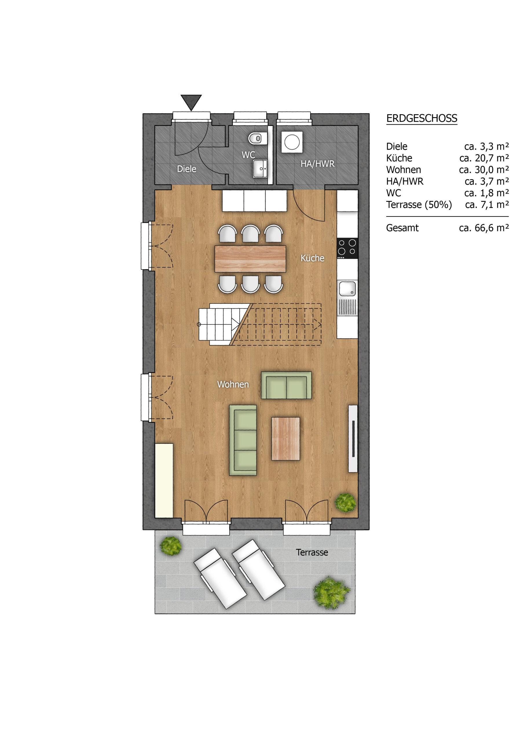 In Deinem neuen Zuhause wohnst Du modern und energieeffizient nach dem KfW-55-Standard. Jedes Haus verfügt über eine eigene Wärmepumpe, die nachhaltige Nahwärme liefert. Der Strom stammt überwiegend aus der hauseigenen Photovoltaikanlage. So werden Ressourcen besonders effizient genutzt und ein zukunftsfähiges, energiesparendes Wohnen ermöglicht.